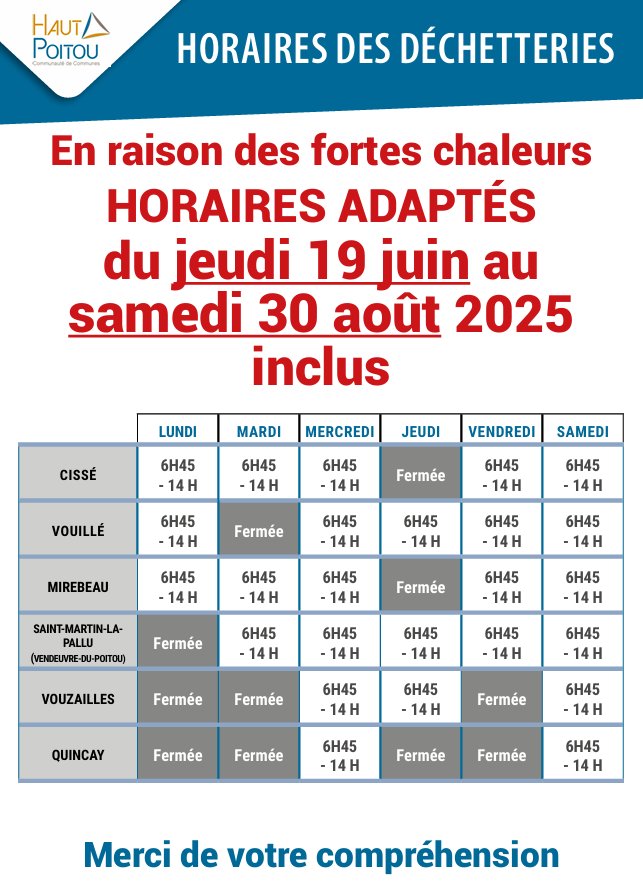 Les élus de la Communauté de communes du Haut-Poitou ont décidé de modifier les horaires d'ouverture des déchetteries jusqu'au samedi 30 août.