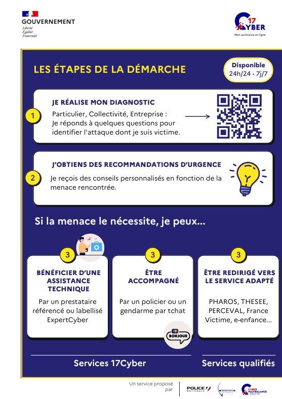 Pour accompagner les particuliers, les entreprises ou les collectivités face à la recrudescence du nombre d'actes de cybermalveillance, le dispositif 17Cyber offre une assistance personnalisée en ligne pour diagnostiquer et résoudre les problèmes. Ce service est proposé par la Police Nationale, la Gendarmerie Nationale et Cybermalveillance.gouv.fr.