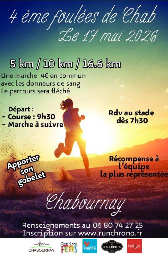 La 4ème édition des Foulées de Chab aura lieu le dimanche 17 mai 2026, au départ du stade René Micheau.