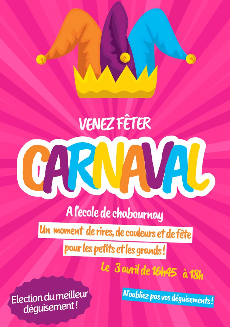 Toute l'équipe des services périscolaires convie les familles des enfants scolarisés à l'école de Chabournay au carnaval qui aura lieu le vendredi 3 avril à partir de 16h45.